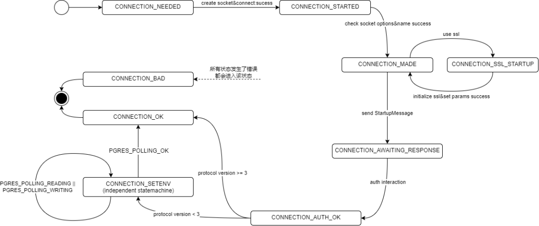 在空的conn 对象建立后,轮询进入初始状态 PGRES_POLLING_WRITING,调用 PQconnectPoll 询问到是否需要等待 conn 建立完成。若仍需等待,则继续等待和状态轮询直到连接建立完成,否则错误返回。