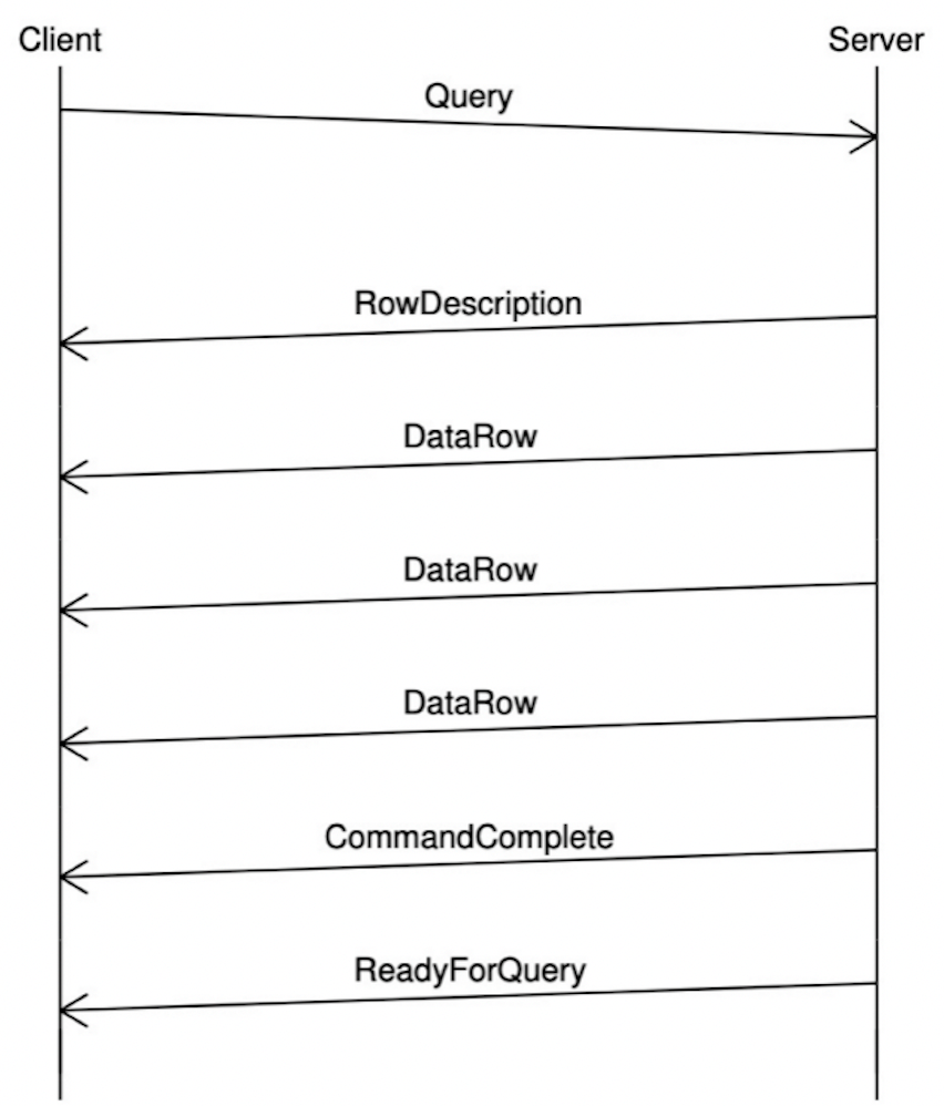 服务端支持消息类型为PostgresMain 函数;客户端支持处理消息类型为pqParseInput3 函数。数据查询阶段常用的通信模式有三种,分别为Simple query、Extended query和Copy data。客户端通过 Query 消息发送一个文本命令给服务端,服务端处理请求,回复查询结果。查询结果通常包括两部分内容:结构和数据。结构通过 RowDescription 消息传递,包括列名、类型 OID 和长度等;数据通过 DataRow 消息传递,每个 DataRow 消息中包含一行数据。每个命令的结果发送完成之后,服务端会发送一条CommandComplete 消息,表示当前命令执行完成。客户端的一条查询请求可能包含多条 SQL 命令,每个 SQL 命令执行完都会回复一条 CommandComplete 消息,查询请求执行结束后会回复一条 ReadyForQuery 消息,告知客户端可以发送新的请求。消息流如下: