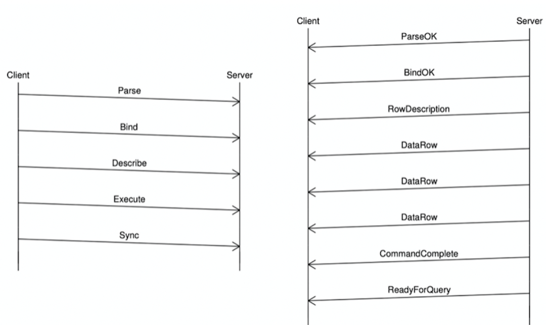 Extended query 协议将以上 Simple query 的处理流程分为若干步骤,每一步都由单独的服务端消息进行确认。Extended query 协议通常包括5个步骤,分别是 Parse、Bind、Describe、Execute 和 Sync,这里不再展开讲述。