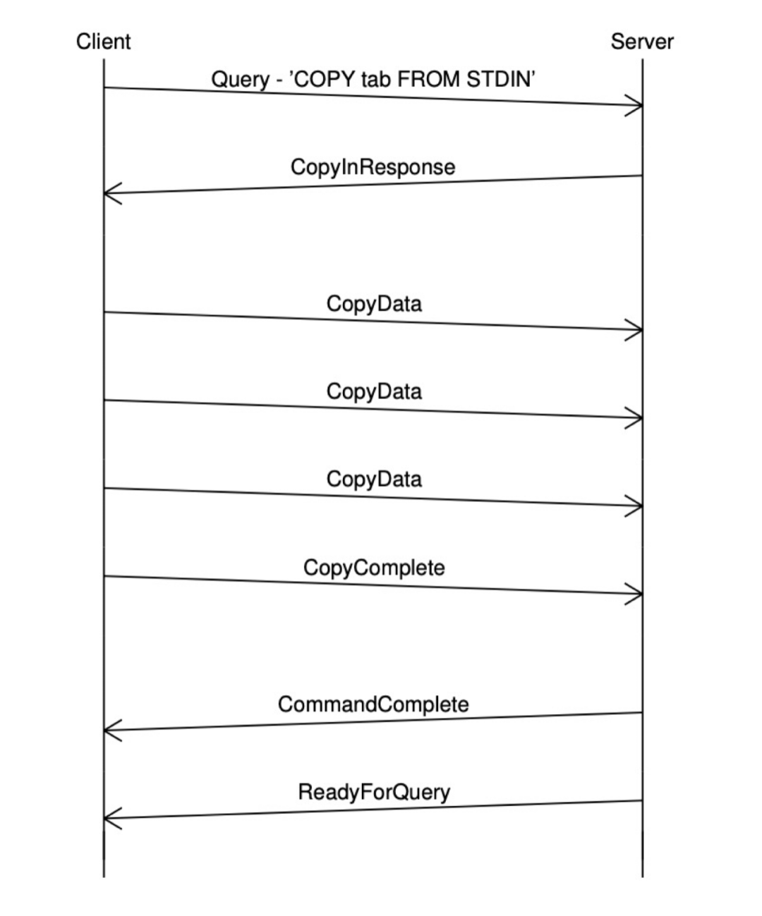 为高效地导入/导出数据,libpq 支持 Copy 命令,Copy操作会将当前连接切换至一种截然不同的消息通信方式。- copy-in 导入数据,对应命令 COPY FROM STDIN;