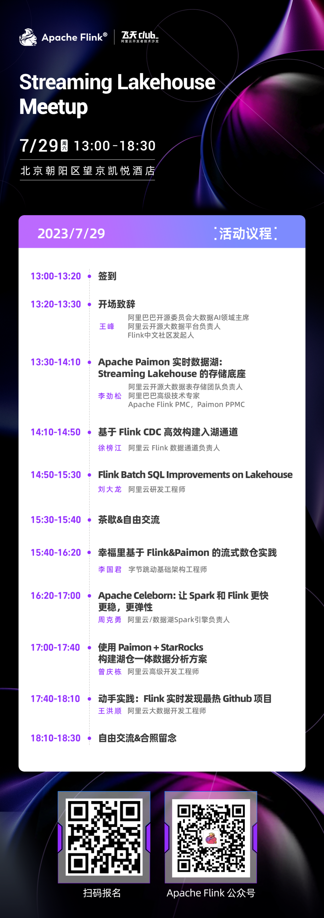 超多实用干货,本场 Meetup 从入湖 Flink CDC、湖存储 Paimon、计算引擎 Flink、批处理 RSS Celeborn、OLAP 分析 StarRocks 全面分享 Streaming Lakehouse 的完整链路,你可以从中获取到为什么要构建 Streaming Lakehouse,如何构建低成本的、准实时的 Streaming Lakehouse,轻松将你的离线数仓实时化!
