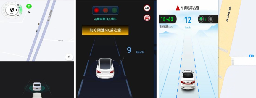 绿波车速引导、车内标牌、车辆违停占道场景示意图