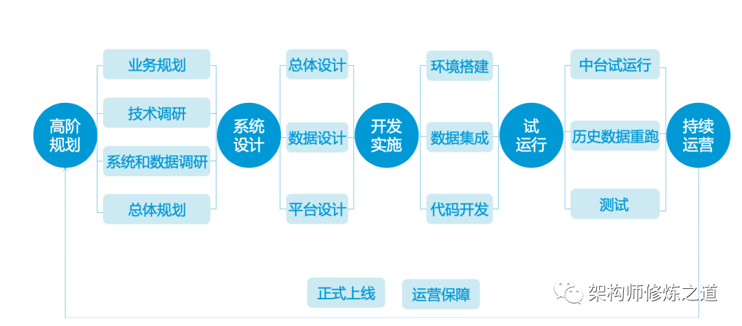 系统都是为应用而生的,数据中台也不例外。要构建一套数据中台服务于企业内部和外部运营,需要有成熟的建设方法论作为指导。数据中台建设方法论可分为高阶规划、系统设计、开发实施、试运行和持续运营 5 个阶段。