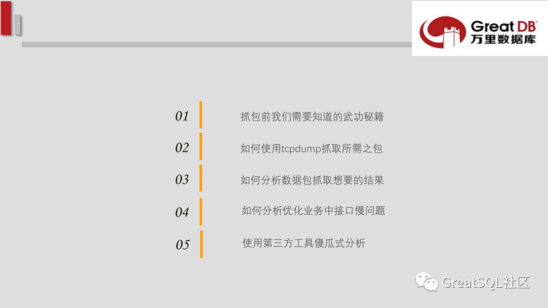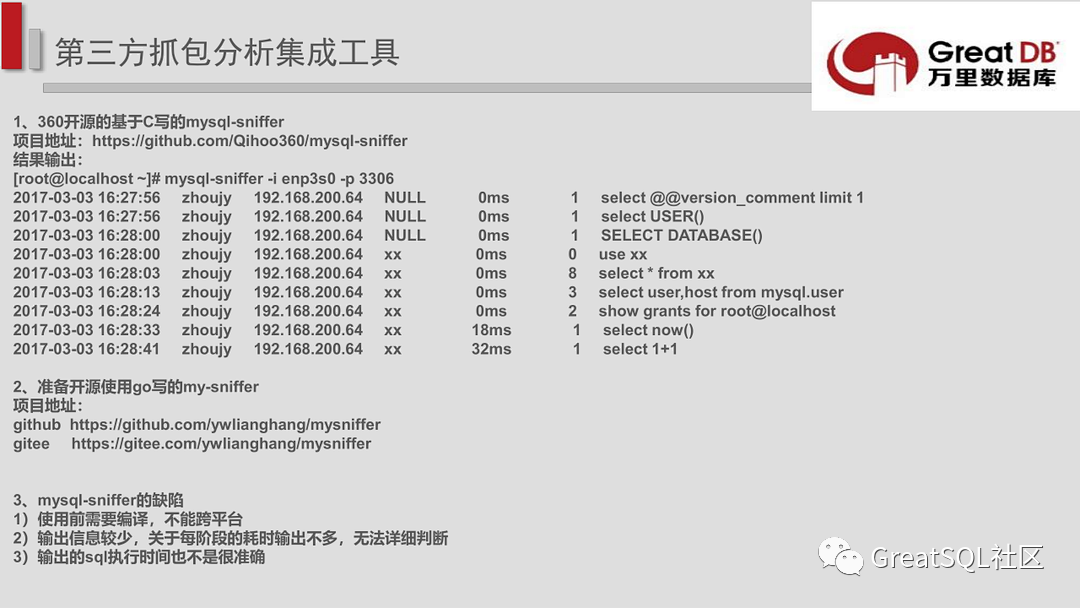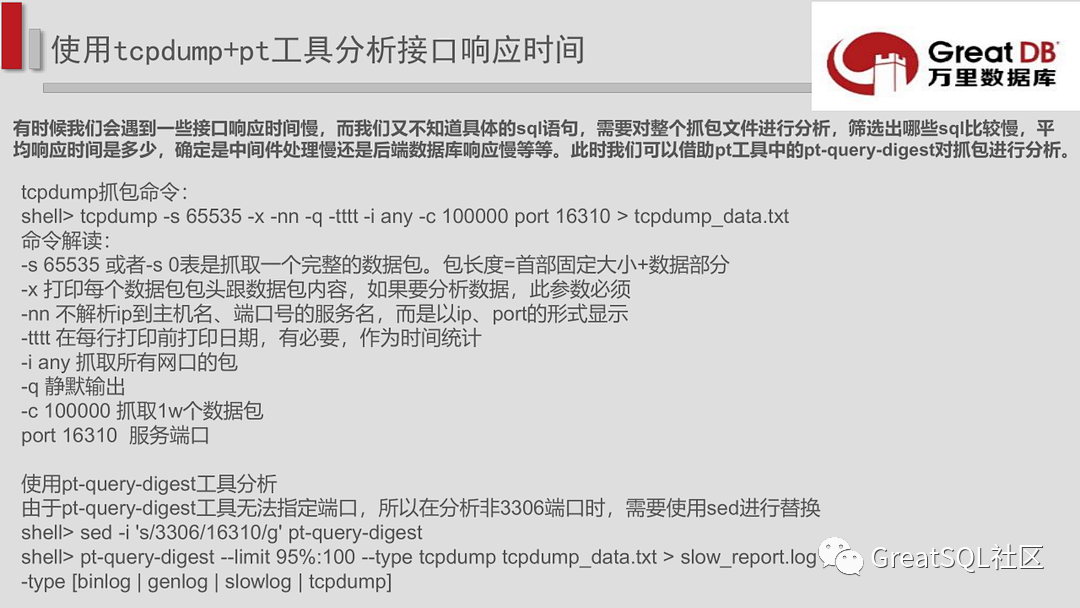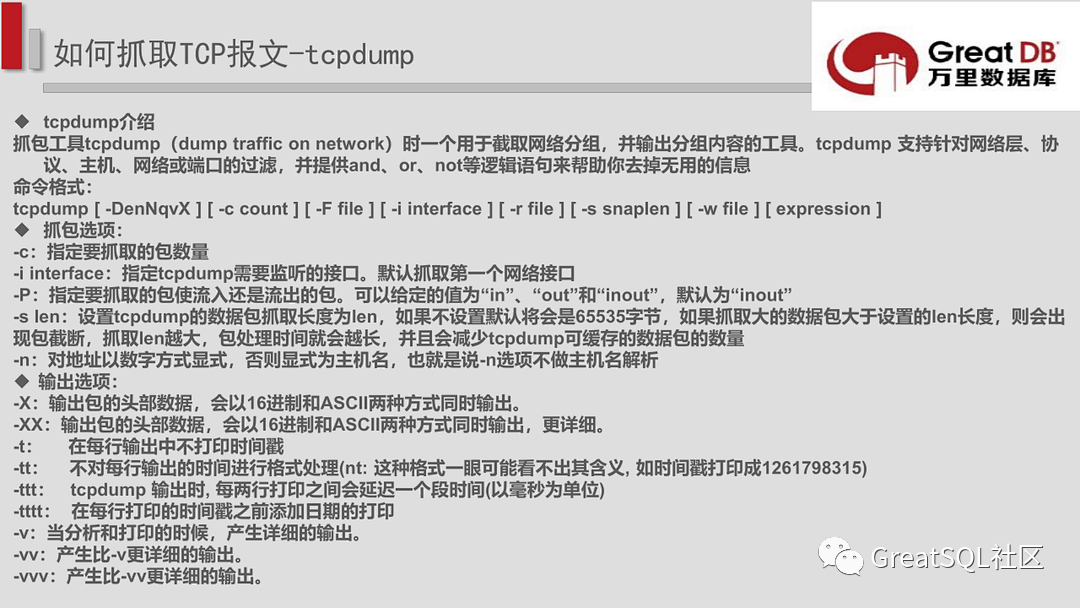 tcpdump是网络抓包常用的工具,参考社群推送的这篇文章《一条sql语句慢在哪之抓包分析》,学习一下,这是一个PPT,下载链接可参考,