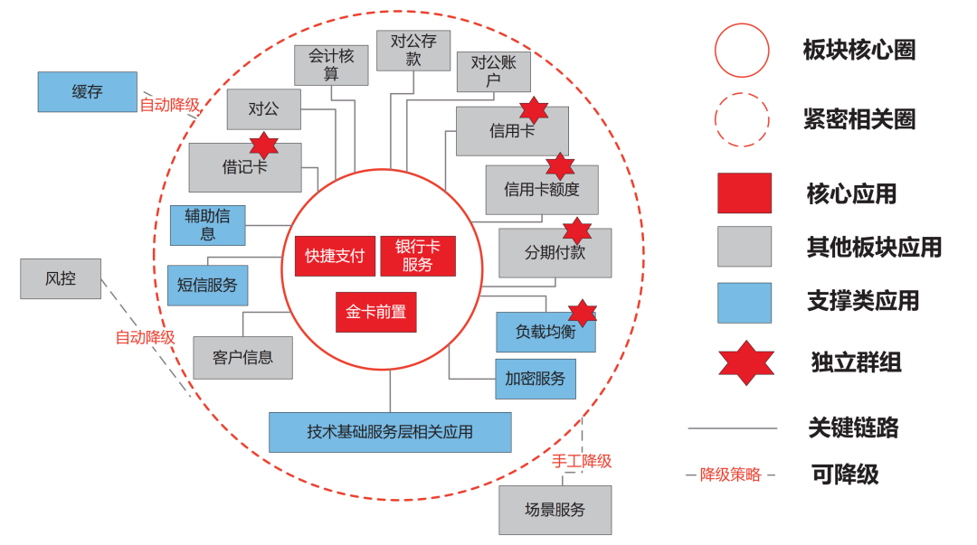 一是由面向应用到面向业务,重新定义运维保障视角。强化运维服务理念,以业务为视角,将传统的面向单个系统或单个应用的运维模式,转变为贯穿业务条线上关联应用和系统的统一运维模式,提升业务运营感知能力。通过梳理业务链路关系,理顺端到端应用的前后调用关系,明确以业务为维度的关联应用清单,开展统一运维管理,包括建立业务级全景监控视图(如图1所示),开展变更交叉影响评估,以业务条线制定技术架构视图,制定统一应急策略等。同时,设立以业务为视角的评价回顾体系,以“1分钟故障发现+5分钟问题定位+10分钟应急止血”为目标,建立以业务场景为维度的监控指标、可用率指标、故障定位时效、故障恢复时效等核心管理指标,对业务真实运维能力和应用版本质量进行量化评价。目前,工商银行已在快捷支付、纪念币预约、理财投资等敏感业务场景上建立了上述以业务为视角的新保障模式,正逐步推广至全行所有应用和业务板块。