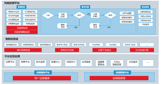 二是建立变更管控体系,提升变更风险防御能力。为减少变更故障给业务带来的影响,工商银行建立了变更事前、事中、事后防御体系(如图4所示),基于智能化手段实现对变更风险的精准把控。事前,通过预设专家规则,构建风险防御规则库,对变更方案的关键要素进行智能模型匹配,实现变更合规性检查、高危命令或脚本的风险预警、变更方案合理性评估、关联变更交叉影响评估等事前防御检测能力;事中,通过实时采集变更日志数据、变更对象应用健康度指标等性能数据,关联日志异常数据分析和性能指标趋势异动监控,实现变更实施过程中的智能阻断;事后,加强对生产环境运行情况的自动巡检,为可能的生产事件根因定位提供变更关联评估报告,实现变更风险管控的闭环管理。