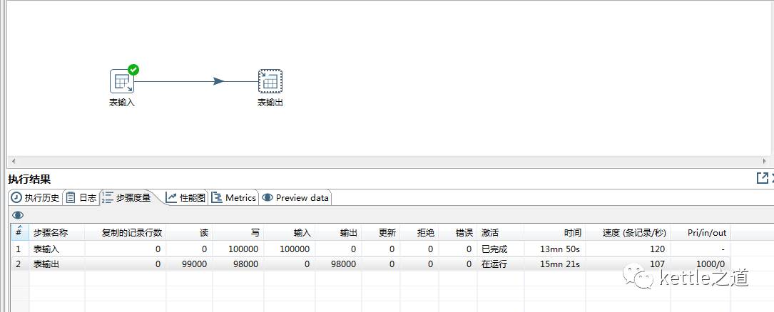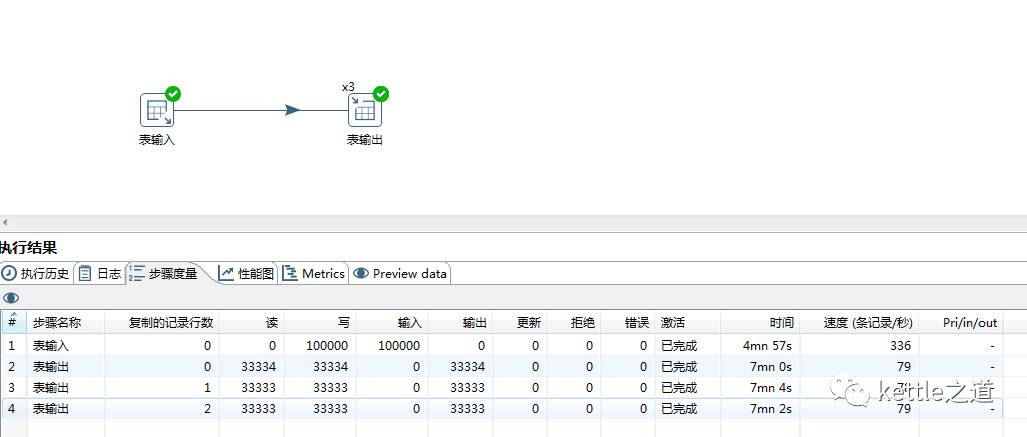 多线程测试:3个线程7分钟跑完,效率提高一倍。“表输出”这个步骤会有3个线程并发执行,而“表输入”将数据流按行通过轮询的方式发送给“表输出”的3个线程
