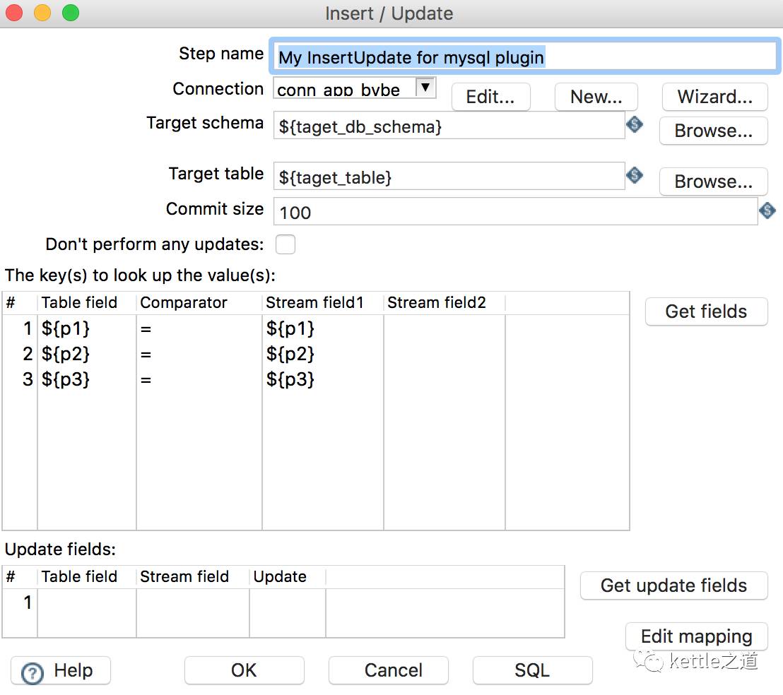 插入更新控件有两个必须条件:key、更新的字段,key可以通过传参的形式把字段传进来,需要扩展etl_ods_table表字段,把源表的key配置进来,一般配置三个key字段就足够;kettle自带的“插入/更新”控件的更新字段是必选项,这样就做不成通用的,因为不可能所有的同步表字段都一样,这就要自定义插件,把更新字段改成非必选项: