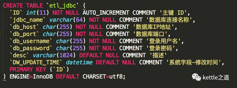 2、数据库连接:配置源表和目标表使用的数据库连接,通过参数传递的形式,实现数据库连接的动态化,配置表结构: