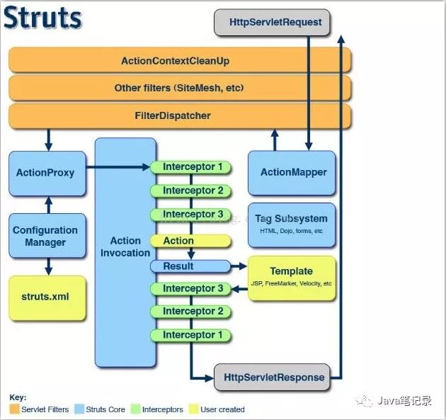 ActionContextCleanUp,然后是Other Filters(如SiteMesh等),最后是FilterDispatcher过滤器。