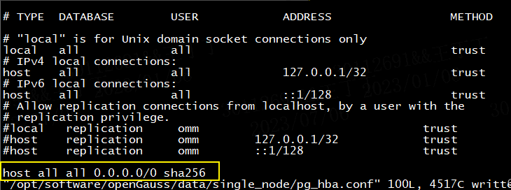 [root@jeames ~]# find -name pg_hba.conf/opt/software/openGauss/data/single_node/pg_hba.conf/opt/pg_hba.conf/var/lib/pgsql/15/data/pg_hba.conf[root@jeames ~]# vi opt/software/openGauss/data/single_node/pg_hba.conf