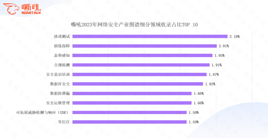 此外,根据嘶吼安全产业研究院调研数据显示,相较于去年安全服务、应用与产业安全、数据安全,依然是网络安全产业三大主流方向,同时其中细分赛道的发展更是引人注目。通过本次调研,在排名TOP10的细分领域包括:渗透测试2.16%、演练保障、态势感知、合规检测、安全意识培训、数据库安全、数据防泄露(DLP)、安全运维管理、可拓展威胁检测与响应(XDR)、零信任。