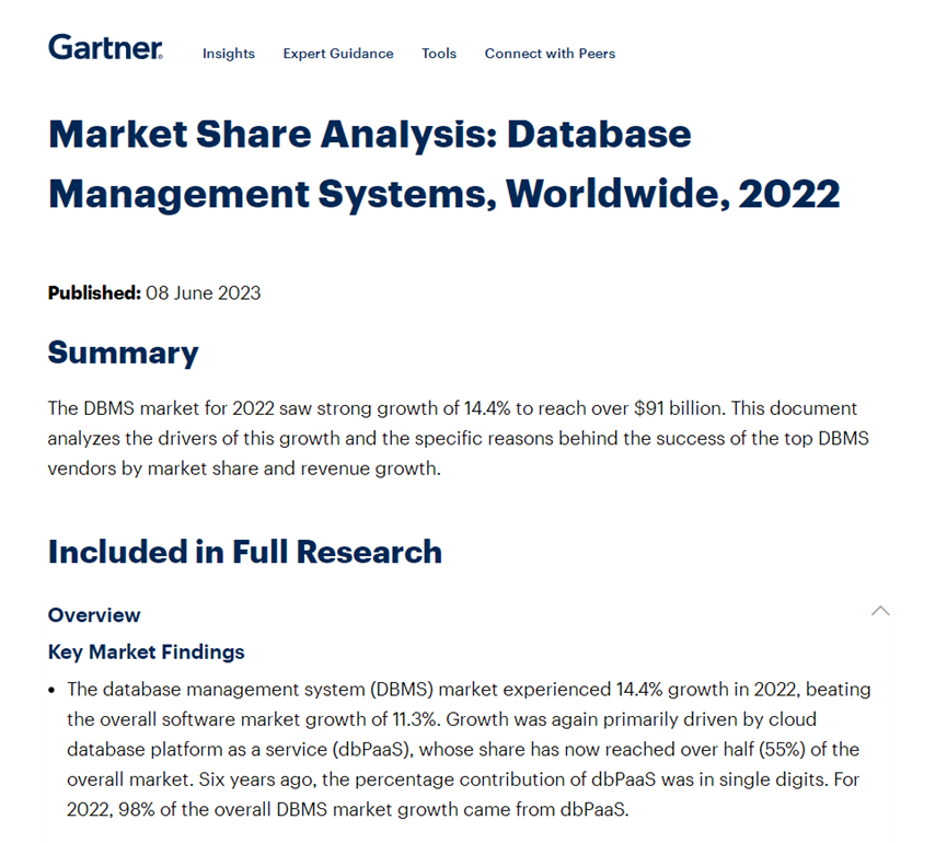Gartner:2022年DBMS市场增量中98%来自云数据库管理平台