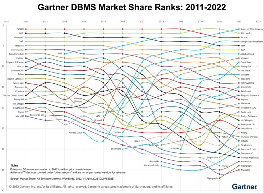 ▲图 | 2021年至2022年DBMS市场份额厂商排名(来源:Gartner)