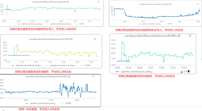 :资源稳定的情况下,存算分离开启本地缓存和存算一体写入基本持平。异步写入参数对于写入性能有较大影响,关闭后对于写入性能有大约 7 倍左右的提升。