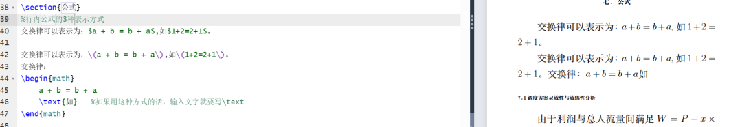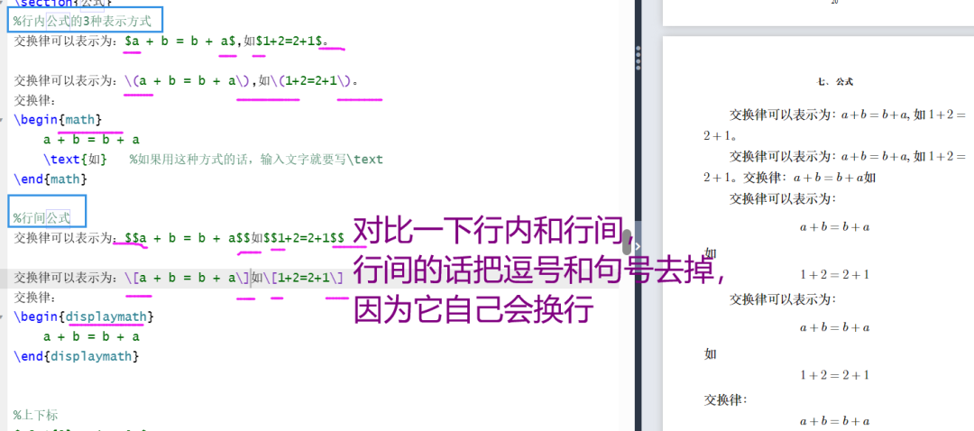 %行内公式的3种表示方式交换律可以表示为:$a + b = b + a$,如$1+2=2+1$。交换律可以表示为:\(a + b = b + a\),如\(1+2=2+1\)。交换律:\begin{math}a + b = b + a\text{如} %如果用这种方式的话,输入文字就要写\text\end{math}
