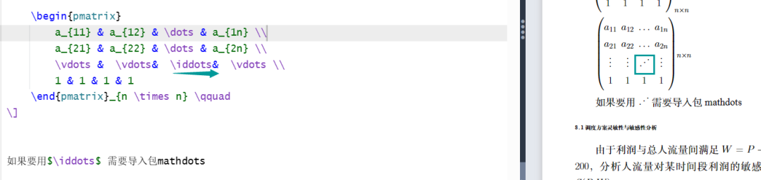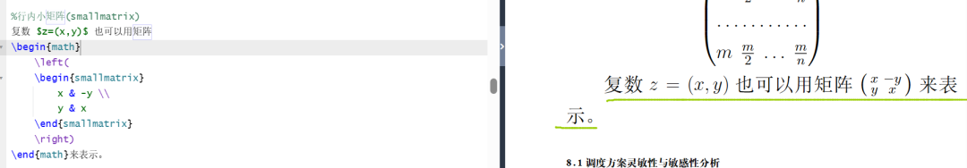 %行内小矩阵(smallmatrix)复数 $z=(x,y)$ 也可以用矩阵\begin{math}\left(\begin{smallmatrix}x & -y \\y & x\end{smallmatrix}\right)\end{math}来表示。