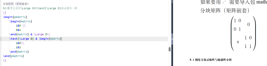 分块矩阵(矩阵嵌套)%在数学公式中\Large 0和\text{\Large 0}表示得不一样\[\begin{pmatrix}\begin{matrix}1&0 \\0&1\end{matrix} & \Large 0\\\text{\Large 0} & \begin{matrix}1&0\\1&1\end{matrix}\end{pmatrix}\]