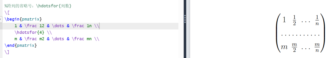 %跨列的省略号:\hdotsfor{列数}\[\begin{pmatrix}1 & \frac 12 & \dots & \frac 1n \\\hdotsfor{4} \\m & \frac m2 & \dots & \frac mn \\\end{pmatrix}\]