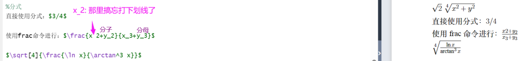 %分式直接使用分式:$3/4$使用frac命令进行:$\frac{x 2+y_2}{x_3+y_3}$$\sqrt[4]{\frac{\ln x}{\arctan^3 x}}$