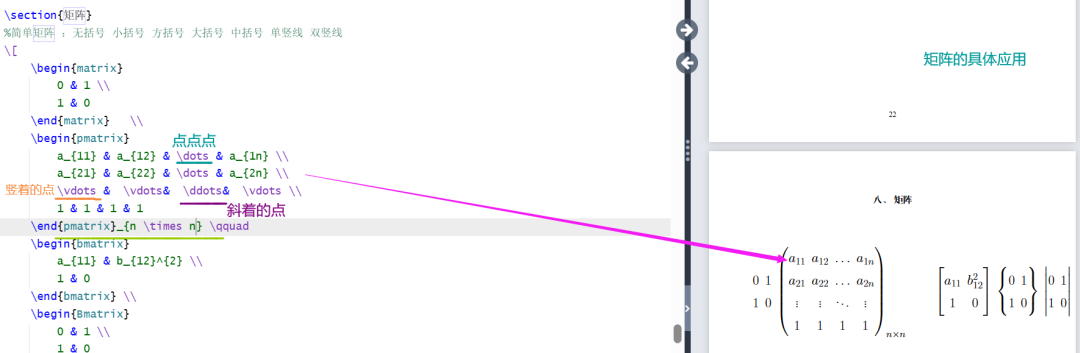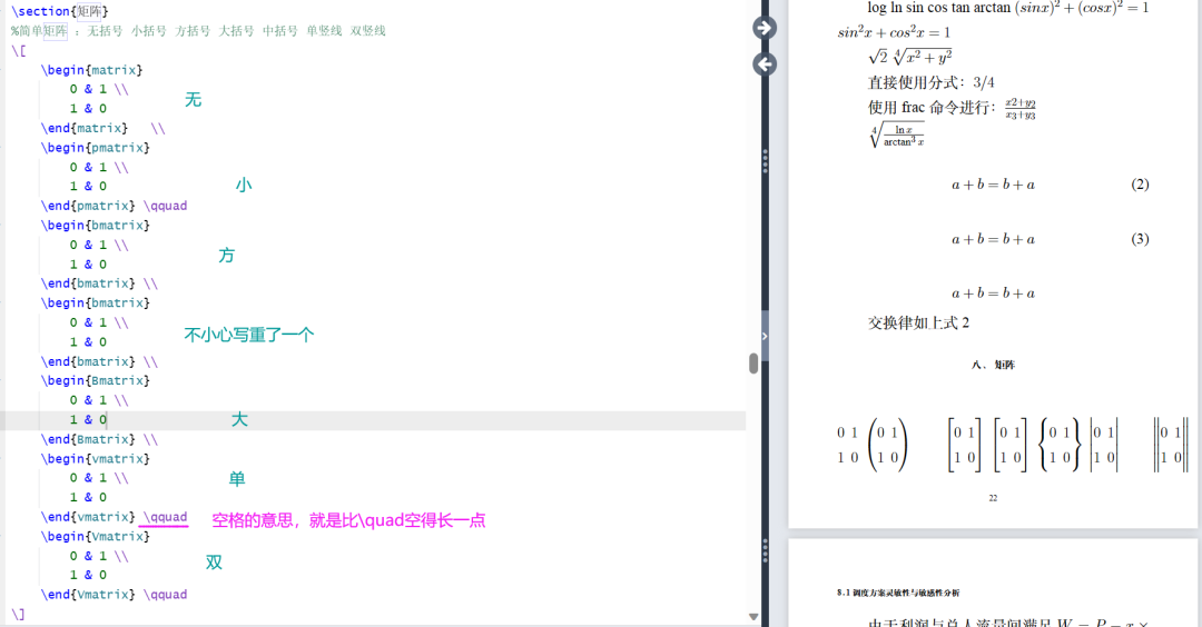 \section{矩阵}%简单矩阵 :无括号 小括号 方括号 大括号 中括号 单竖线 双竖线\[\begin{matrix}0 & 1 \\1 & 0\end{matrix} \\\begin{pmatrix}0 & 1 \\1 & 0\end{pmatrix} \qquad\begin{bmatrix}0 & 1 \\1 & 0\end{bmatrix} \\\begin{Bmatrix}0 & 1 \\1 & 0\end{Bmatrix} \\\begin{vmatrix}0 & 1 \\1 & 0\end{vmatrix} \qquad\begin{Vmatrix}0 & 1 \\1 & 0\end{Vmatrix} \qquad\]