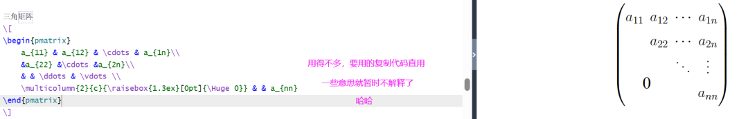 三角矩阵\[\begin{pmatrix}a_{11} & a_{12} & \cdots & a_{1n}\\&a_{22} &\cdots &a_{2n}\\& & \ddots & \vdots \\\multicolumn{2}{c}{\raisebox{1.3ex}[0pt]{\Huge 0}} & & a_{nn}\end{pmatrix}\]
