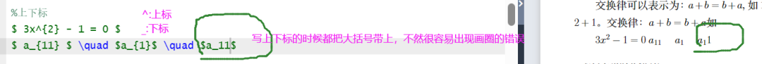 %上下标$ 3x^{2} - 1 = 0 $$ a_{11} $ \quad $a_{1}$ \quad $a_11$