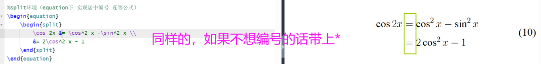 %split环境(equation下 实现居中编号 连等公式)\begin{equation}\begin{split}\cos 2x &= \cos^2 x -\sin^2 x \\&= 2\cos^2 x - 1\end{split}\end{equation}