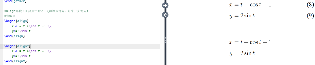 %align环境(主要用于对齐)(如等号对齐,每个开头对齐)%带编号\begin{align}x & = t +\cos t +1 \\y&=2\sin t\end{align}\begin{align*}x & = t +\cos t +1 \\y&=2\sin t\end{align*}