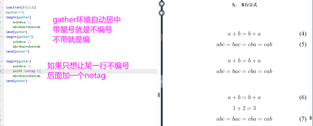 \section{多行公式}%gather环境\begin{gather}a+b=b+a \\abc=bac=cba=cab\end{gather}\begin{gather*}a+b=b+a \\abc=bac=cba=cab\end{gather*}\begin{gather}a+b=b+a \\1+2=3 \notag \\abc=bac=cba=cab\end{gather}