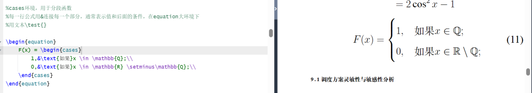 %cases环境,用于分段函数%每一行公式用&连接每一个部分,通常表示值和后面的条件,在equation大环境下%用文本\test{}\begin{equation}F(x) = \begin{cases}1,&\text{如果}x \in \mathbb{Q};\\0,&\text{如果}x \in \mathbb{R} \setminus\mathbb{Q};\\\end{cases}\end{equation}