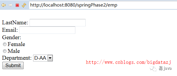 这是为什么呢,因为表单在显示的时候会做一个检查,如果表单的字段在request的bean中不能一一对应,就会无法显示并报错,说白了就是这里加上了employee这个bean后,这个对象中的各个属性如email、gender和表单上的字段都能够对应起来了,校验通过,就能正常添加保存了。