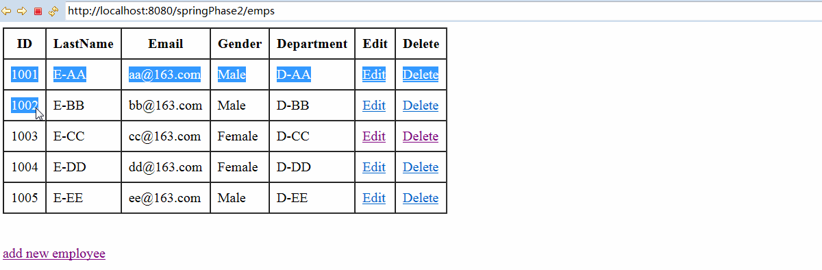 employees.put(1002, new Employee(1002, "E-BB", "bb@163.com", 1, new Department(102, "D-BB")));