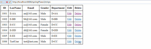 其实从前面的list.jsp的表格中已经看出来了,在每条记录后面都有一个DELETE选项,用于删除该项记录,那么具体怎么实现