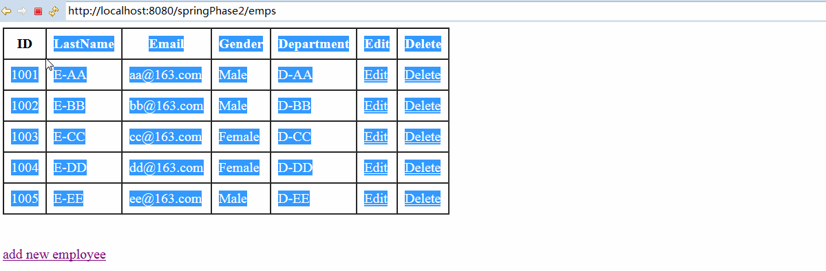 employees.put(1003, new Employee(1003, "E-CC", "cc@163.com", 0, new Department(103, "D-CC")));