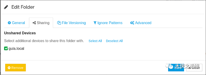 您会在第一个节点上看到一个弹出窗口询问是否添加第二台机器。接受后,新的机器将显示在第一个机器的右下方。与第二台机器共享默认目录。点击“默认文件夹”,然后点击“编辑”按钮。弹出窗口顶部有四个链接。点击“共享”,然后选择第二台机器。点击保存并查看第二台机器。您会收到一个提示,询问是否接受共享目录。接受后,它将开始在两台机器之间同步文件。