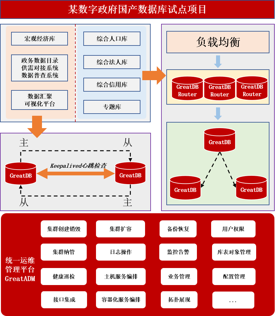 某省数字政府中的多个业务系统原来使用MySQL数据库,存在独立部署、无法统一管理等问题。根据不同业务系统的数据量大小,该省数字政府项目选用Keepalived双主高可用架构和GreatDBRouter+GreatDB高可用架构进行业务部署。