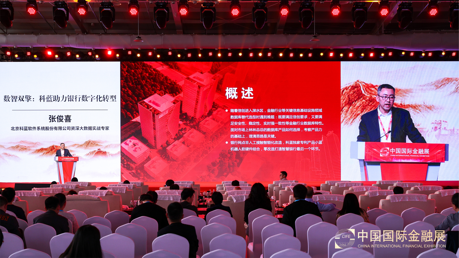 中国国际金融展大会上,中国人民银行行长易纲、北京市委常委、副市长靳伟出席了开幕式。在随后举行的金融科技创新成果展示和金融科技优秀成果交流活动中,科蓝大数据领域实战专家张俊喜发表了《数智双擎:科蓝助力银行数字化转型》主题演讲。