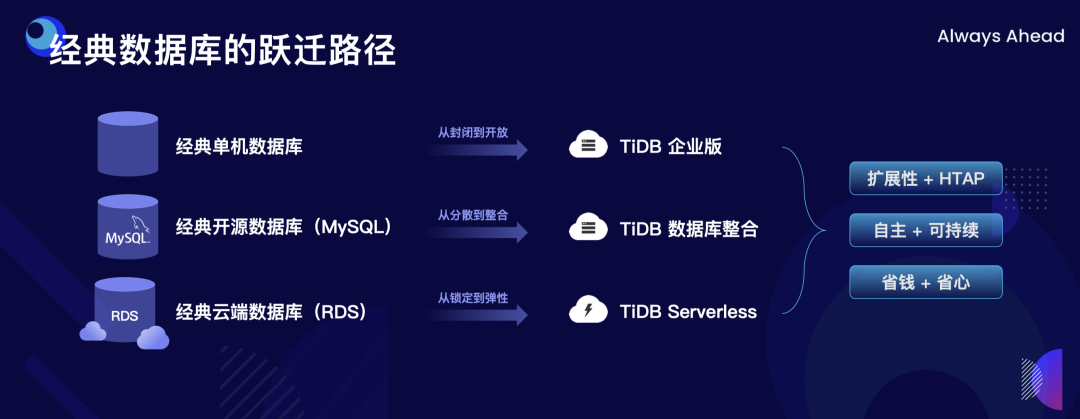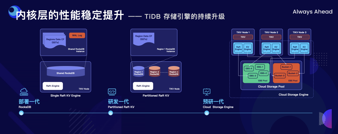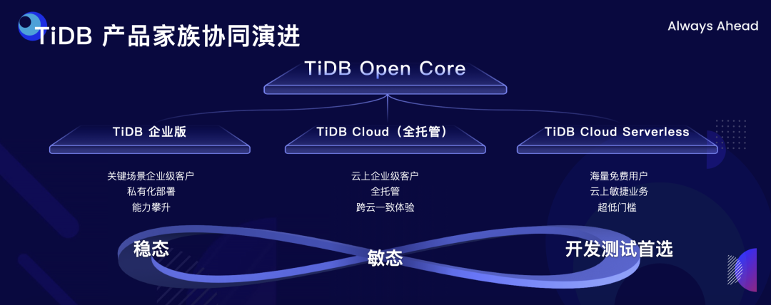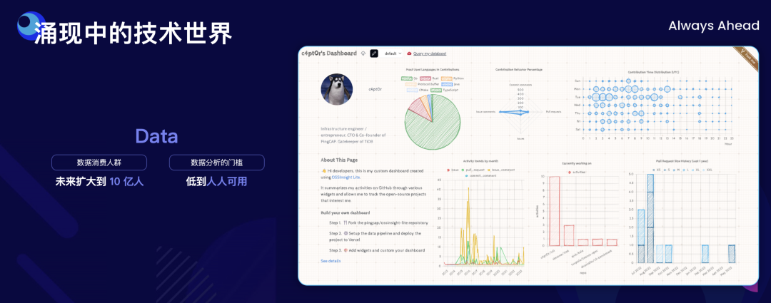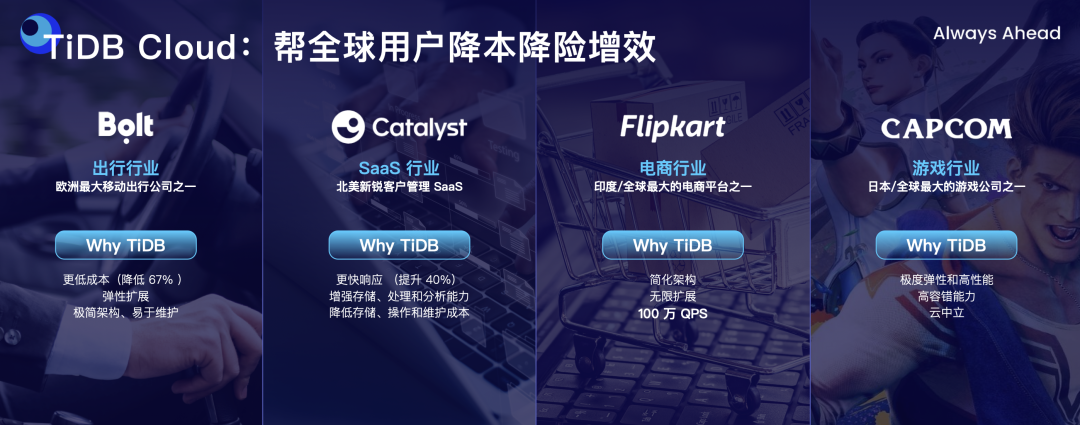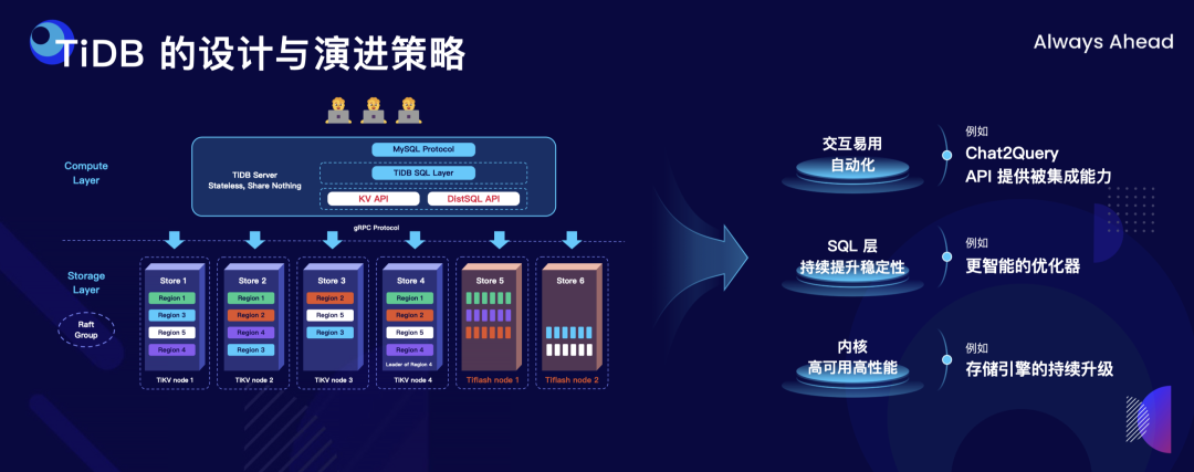 作为一家软件公司,我们思考的问题直接体感通常有两个:一个是代码,一个是数据。先从代码说起,大家有没有意识到,很多人在过去一段时间不自觉地变成了程序员。今天,我们向 ChatGPT 提问题,它会给我们一个答案;向它提要求,它会给我们一个结果。比如我们可以让 ChatGPT 做总结、写文章,或者让它生成图片。大家可以回忆一下,在 AI 时代到来之前,所有这些工作都需要用程序去完成。我们需要用各种各样的辅助工具,那些东西都需要编程开发。而今天,我们没有写任何一行代码,只是提了个需求,结果就有了。以前,这需要很多程序员很长时间努力才能得到一样的结果。而现在,我们向 AI 发命令、提要求、提问题就能拿到结果,事实上就等于完成了编程工作。现在,自然语言已经成为最热门的编程语言。在过去七个月的时间里,GitHub 上新增代码中已经有超过 46% 是由 AI 生成的。如果从软件开发效率的角度看,AI 实际上已经完成差不多一半的人类工作。再说数据,我们今年一月份发布了一个 AI 生成 SQL 的产品,叫 Chat2Query(前往 tidbcloud.com 立即注册体验),用户使用 Chat2Query 就不需要再写 SQL 了,只要用自然语言描述一下希望得到什么数据,希望做一个什么分析,SQL 便会自动生成,只要在数据库里运行一下,就能得到想要的结果,并且还能用图表化的形式自动展示出来。上图右侧是 PingCAP CTO 黄东旭在 GitHub 上的个人数据看板。以前要实现这样一个数据看板,需要一个前端程序员、需要一个数据分析人员写 SQL 来分析数据,还需要一个后端程序员部署服务,甚至还需要知道一点云的知识,理解如何把应用部署在云上。到了今天,这变成一件非常简单的事情,只需十分钟,一行代码都不用写。这是一次巨大的生产力提升,AI 带来的能力让数据消费的门槛变得极低。以前,我们必须是一个 SQL 的专家,才能分析数据。有人曾经写过一万多行的 SQL 来处理一个分析需求,这个东西不是人类能轻易掌握的。如今,这个门槛已经降到人人都有可能做到。这意味着我们只要能够连接上电脑,能和 AI 交互,能接触到数据,就可以消费数据。这个数量级可能达到 10 亿人。在接下来的几年里,由数据消费门槛降低带来的数据消费人数的增加,数据消费频次的增长,将使数据呈 10-100 倍规模的增长,这是一个远超我们预期的增速。以上改变,将给数据库带来巨大的挑战,数据消费的门槛降到人人可用的程度,需要每个人都有一个数据库可用。早在四五年前,我和 CTO 黄东旭探讨过一个话题——如果 PingCAP 要为全世界所有开发者提供一个免费的数据库,那这个数据库的架构应该是什么样?我们希望这个数据库能够做到实时在线,随时都可以访问,随时都可以用;我们也希望它是一个开放的生态,因为我们不仅仅有存在数据库里面的数据,还有很多存在其他地方的数据,我们需要有一个生态能够和所有数据消费端做更好的对接。后来,我们形成了一个结论,起码它应该是个云原生的架构。如果不是云原生的架构,我们就没有办法去应对各种各样弹性的需求;今天,一个用户相对容易预测,那为全球所有开发者都提供一个免费的数据库,就意味着我们会有数千万甚至数亿的用户,这个数据库怎么才能做得到?它需要很强的数据整合能力;其次,因为不同用户的需求是不一样的,数据量也不同,我们需要它有非常强的弹性扩展能力。过去这两年的变化特别快,大家感知最直观的可能是宏观经济变化很快,其实除此之外,AI 技术的进步速度也非常快。从 ChatGPT 在去年 11 月底推出,到今天才过去短短八个月的时间。这八个月中已经创造了无数新的纪录,包括一个新的项目在 GitHub 上面获得 Star 的数据、ChatGPT 用户增长的速度等等。大家在面对大量新技术的时候,都做出了最直观的选择,那就是拥抱先进性。过去一段时间我在与美国、日本的客户交流时,最直接的感受是每个人都在讨论两个方向,一个是成本,另一个是效率。在当前经济环境下,这几乎成了所有人的共同选择。如果仔细观察 TiDB 发展的轨迹,你就会发现用户对数据库的关注点,其实和 TiDB 实际解决的问题是高度一致的。TiDB 在稳定性、性能、高可用性、易用性、工具生态的提升等方面付出了巨大努力。但我们认为这件事光努力还不够,我们还需要有一个非常好的演进策略以及分层的架构设计。在内部,我们有一个说法叫做 API First,各个模块之间优先设计 API(接下来我们也会推出更多基于 Open API 规范的 API 测试),有了 API 之后系统就很容易被其他各种各样的业务系统集成。举个例子,各大型用户基于 TiDB 都有自己公司内部的运维平台,通过我们提供的 API 能更好地融合到客户内部的平台里。在日本我和一个客户交流的时候,对方专门提到过这一点。过去他们需要花几天时间才能完成新版本的集成,但有 API 之后只要花几分钟就能做到。TiDB 整个系统除了模块化的切分,也做了很好的纵向切割,从上到下分成三层。比如 Chat2Query 在最上面一层,这层会更关注整个系统的交互性、易用性,如何让系统更加自动化、更加智能;在 SQL 层主要关注如何提升它的稳定性,让它变得更加智能。比如 TiDB 的优化器如何更智能地选择,到底使用行存还是列存,还是让行列同时使用;最下面是内核层,所有人对此的关注点都一样,就是高可用、高性能。在内核层,TiDB 的存储引擎使用了一个持续升级的策略
