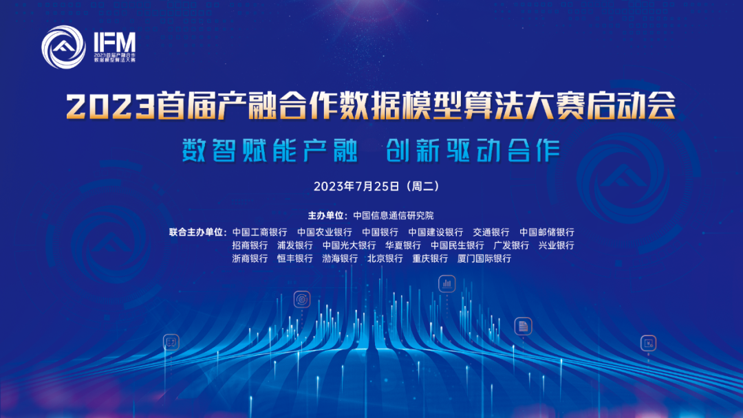 大赛启动会将于2023年7月25日下午14:30-17:40在中国信息通信研究院举行,邀请产融合作相关产业主管部门、金融主管部门,院士及行业专家,行业协会,高校及科研院所,银行、证券、保险、金融科技公司领导及代表共同参与。