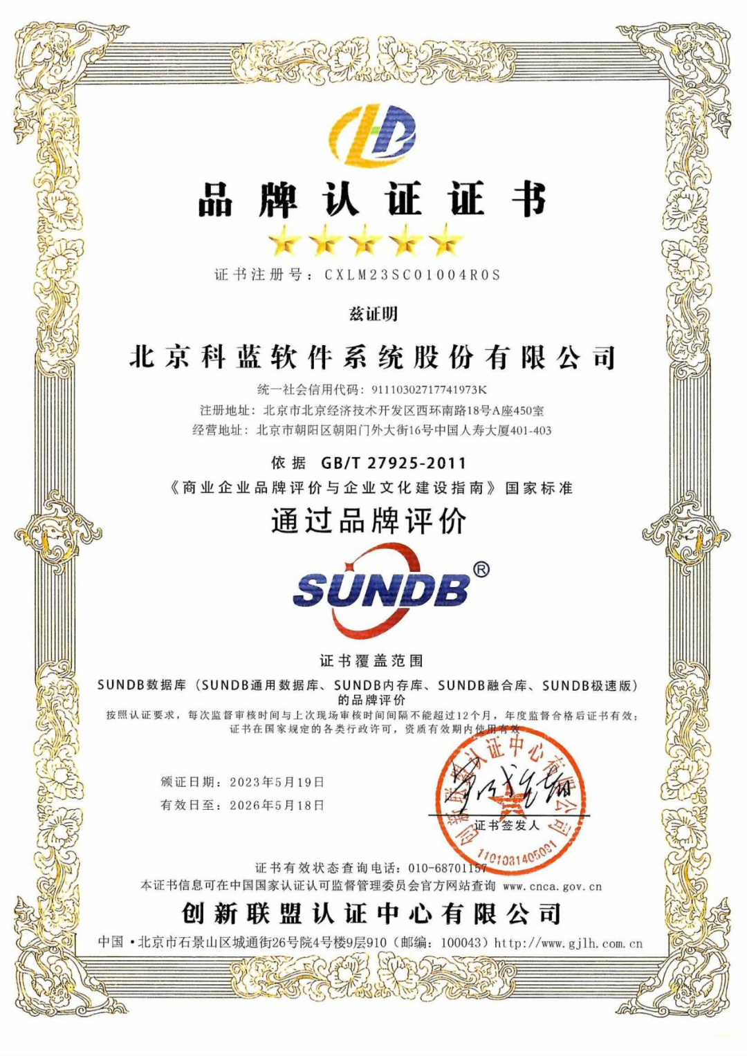近日,依据GB/T27925-2011《商业企业品牌评价与企业文化建设指南》国家标准,科蓝软件SUNDB数据库通过国家认证认可监督管理委员会批准的权威认证机构颁发的品牌认证证书。这是国家权威机构首次将SUNDB作为单个独立品牌,给予颁发的品牌认证证书,本证书也是SUNDB数据库产品品质的“身份证”。