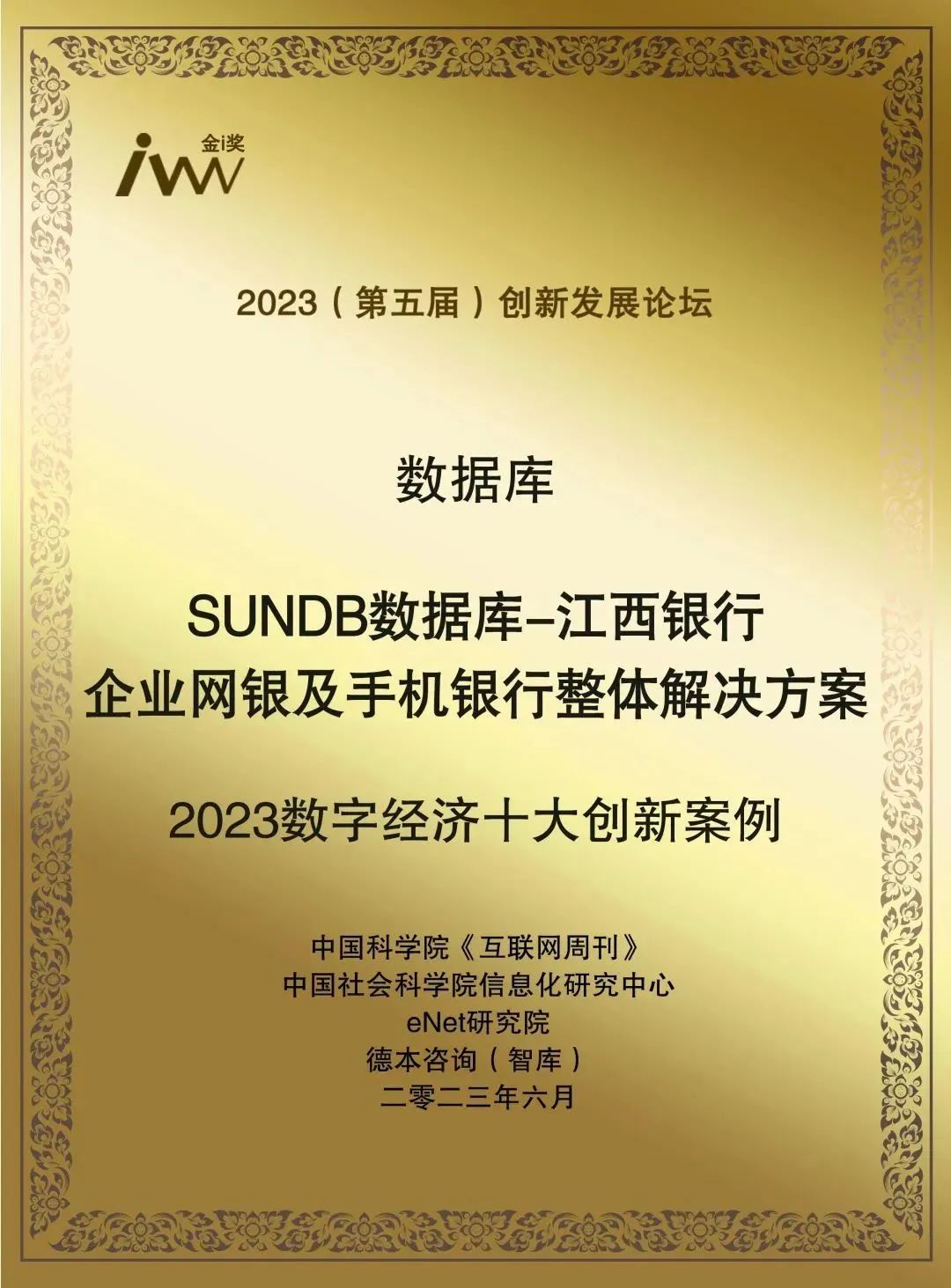 近日,由中国科学院《互联网周刊》、中国社会科学院信息化研究中心、eNet研究院、德本咨询联合主办的“2023(第五届)创新发展论坛”上,发布了2023年度的金i奖榜单,科蓝SUNDB数据库凭借江西银行企业网银及手机银行整体解决方案,为数字金融安全可控打造坚实底座,该案例成功斩获“2023数字经济十大创新案例”奖。