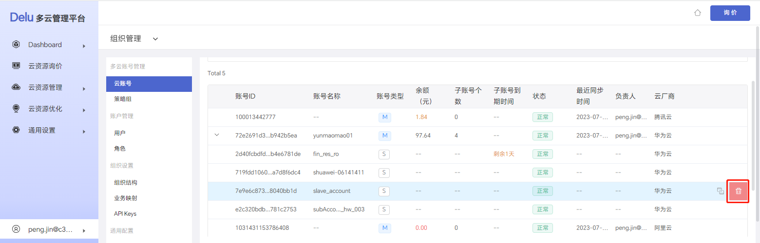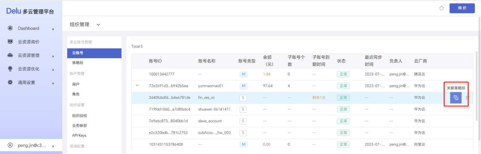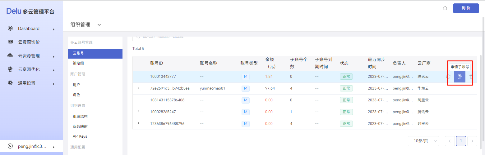登录Delu多云管理平台,选择左侧导航栏中的 通用设置 > 组织管理 > 云账号,进入 云账号页面。再点击云账号左侧的 >,展开子账号后,您可进行以下操作: