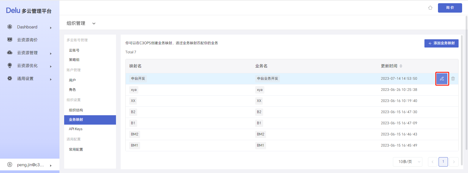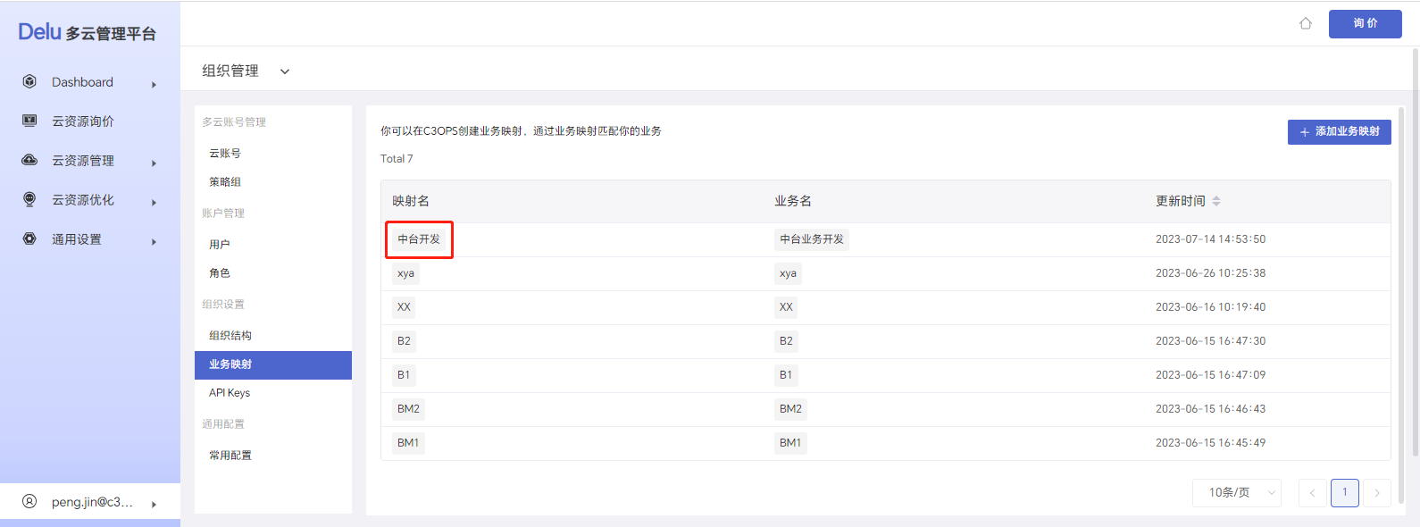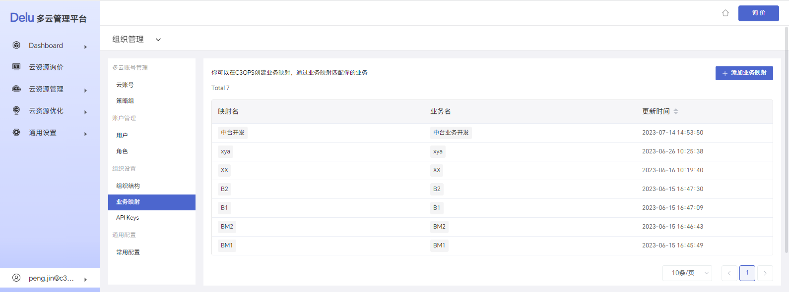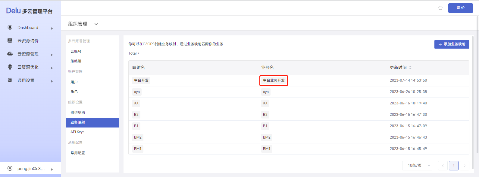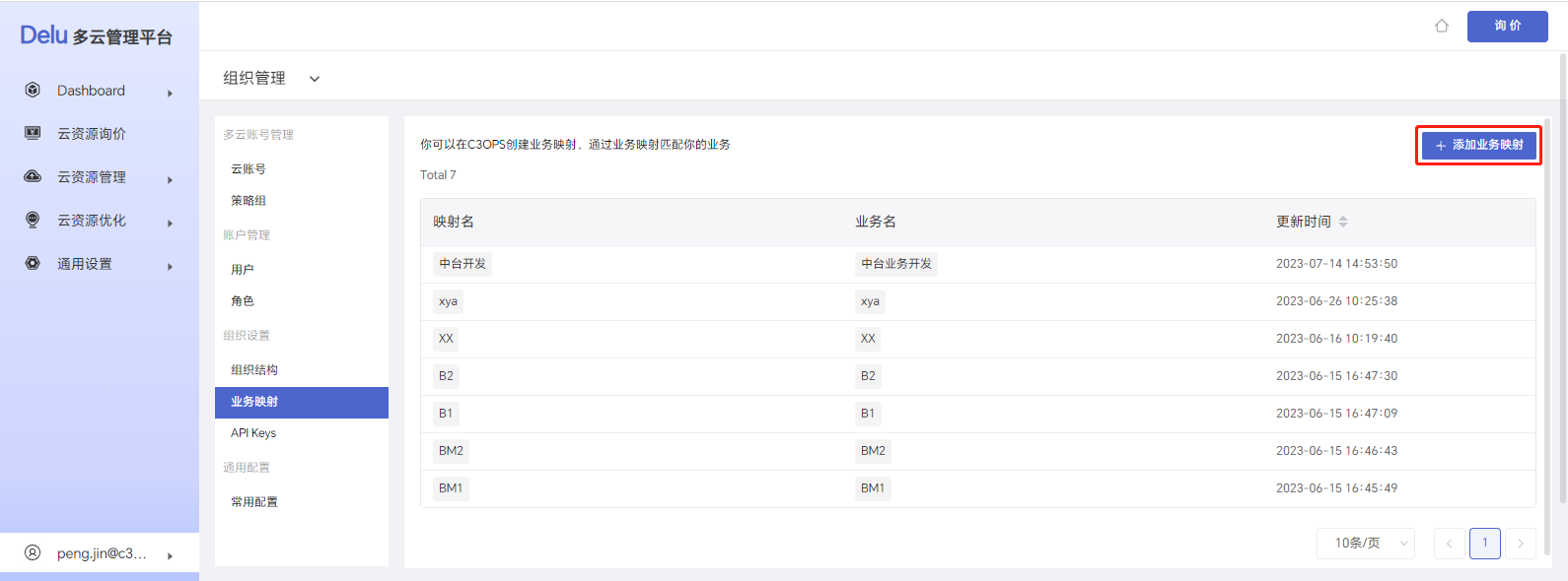 登录Delu多云管理平台,选择左侧导航栏中的 通用设置- 组织管理 - 业务映射,即可进入业务映射列表页面,查看当前租户下的所有业务映射。