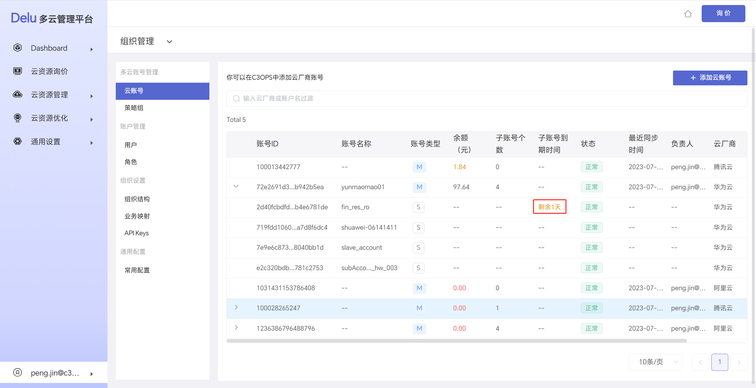 云账号列表中会以醒目颜色表示即将到期。