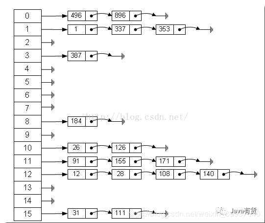 左边很明显是个数组,数组的每个成员包括一个指针,指向一个链表的头,当然这个链表可能为空,也可能元素很多。我们根据元素的一些特征把元素分配到不同的链表中去,也是根据这些特征,找到正确的链表,再从链表中找出这个元素。
