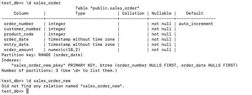 create table sales_order_new(order_number INT NOT NULL AUTO_INCREMENT,customer_number INT NOT NULL,product_code INT NOT NULL,order_date DATETIME NOT NULL,entry_date DATETIME NOT NULL,order_amount DECIMAL(18,2) NOT NULL,primary key(order_number,order_date)) partition by range(order_date);create table sales_order_p0 partition of sales_order_newfor values from ('2021-01-01') to ('2021-05-01');create table sales_order_p1 partition of sales_order_newfor values from ('2021-05-01') to ('2021-09-01');create table sales_order_p2 partition of sales_order_newfor values from ('2021-09-01') to ('2022-01-01');
