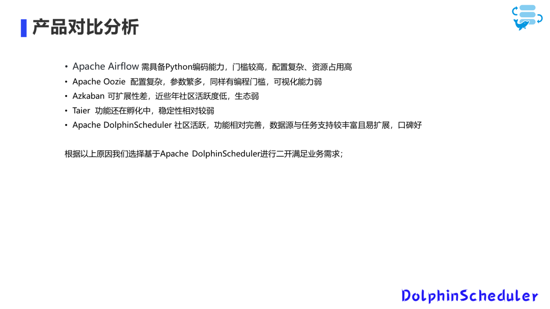 最终,我们选择了 Apache DolphinScheduler,因为它具有较为活跃的社区、丰富的功能扩展性和文档支持。