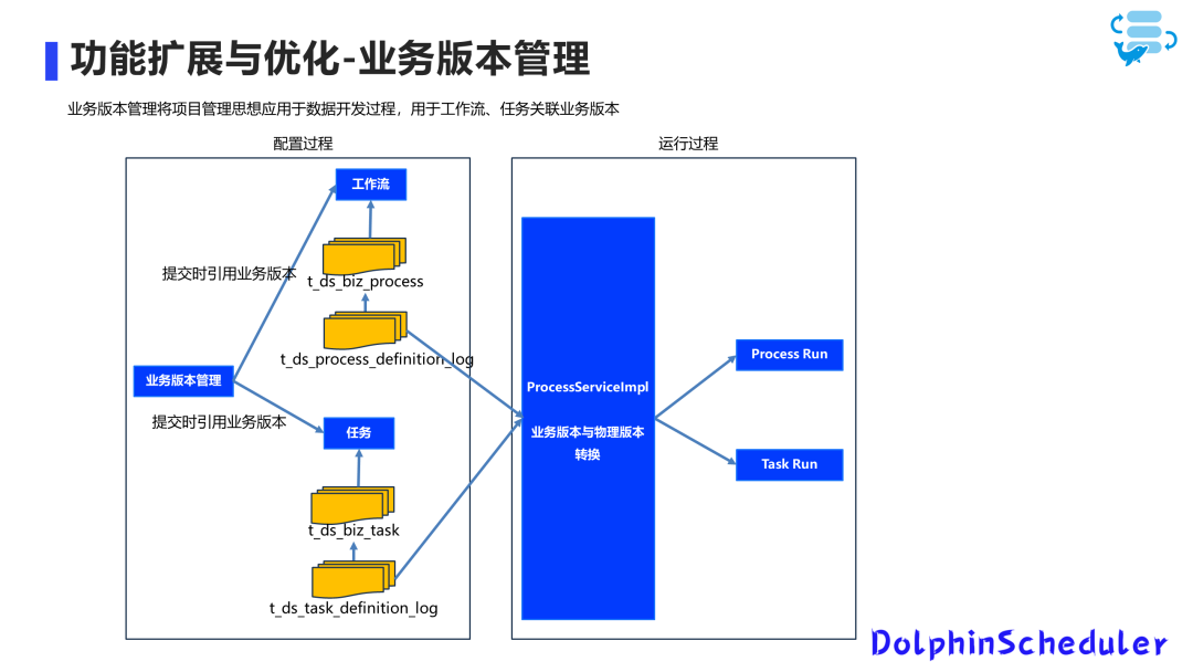 在发布之前,我们可以将工作流或任务提交到具有业务含义的业务版本上,并建立与底层的工作流和任务定义表的映射关系。在运行过程中,我们将业务版本转换为物理版本,并进行执行和展示。