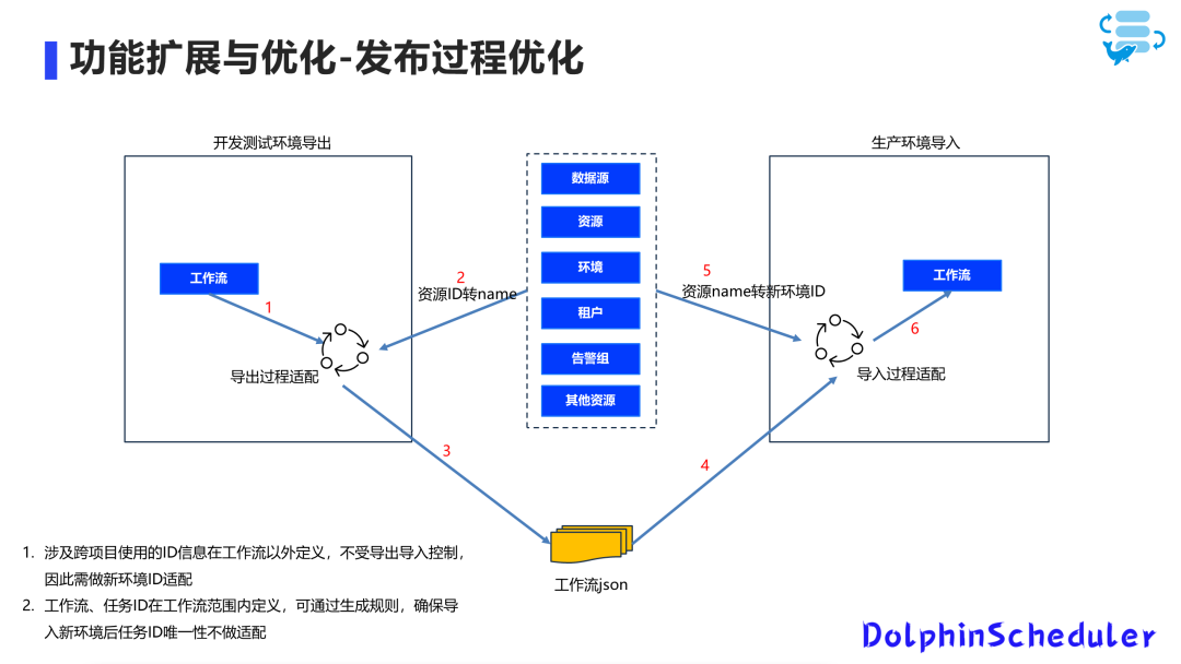 我们发现原有的导出导入功能在开发、测试和生产环境中的发布过程中存在问题。做了适配之后,将测试环境中的资源ID转换为名称,并在导出的工作流 JSON 中进行导出。
